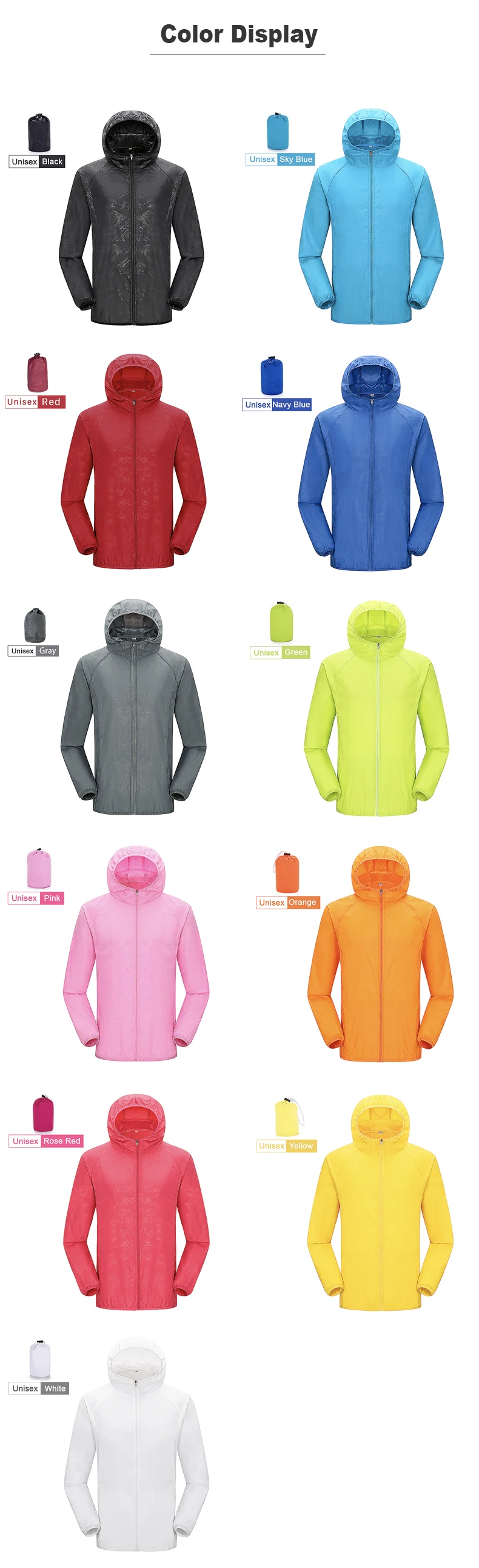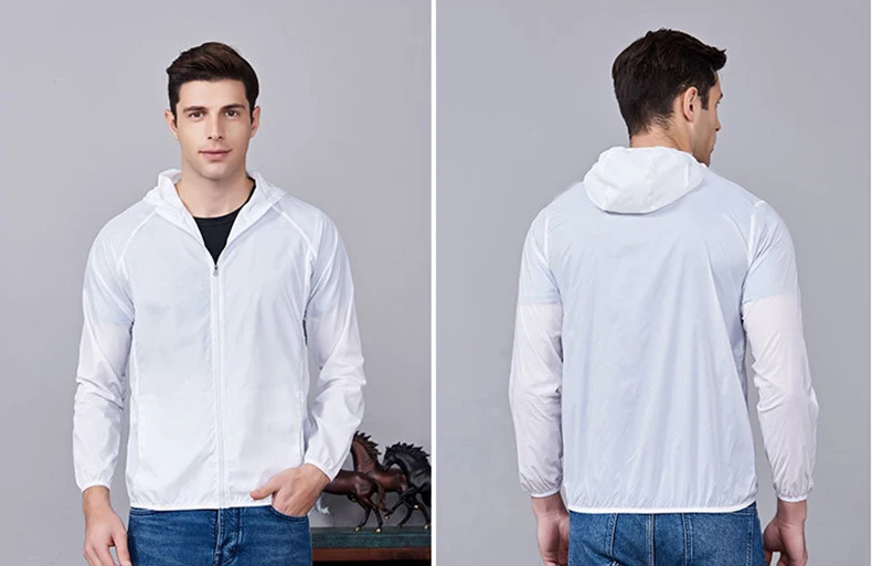 Casaco de pele leve, macio e protetor solar com bolsa de armazenamento, compacto e fácil de transportar, 11 cores para escolher. Adequado para esportes ao ar livre, como caminhadas, camping, corrida, pesca e ciclismo.